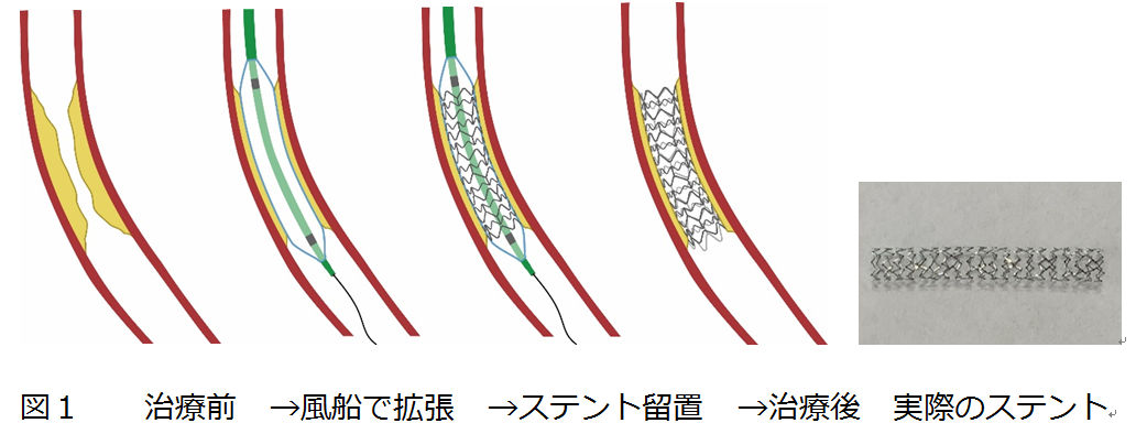 狭心症や心筋梗塞に対して行われる治療で、狭くなったり閉塞したりした心臓の筋肉(心筋)を栄養する冠動脈に対する治療です。胸を開く外科的治療と違って、手首もしくは足の付け根の動脈からカテーテルを用いて治療を行う事から、経皮的と言われています。太さ2~3mmのカテーテルの中を通して、バルーン(風船)やステント(金属の網)を狭窄・閉塞部位まで運んで、その場所で拡げる事により狭窄を解除して血管内腔を確保する治療です。