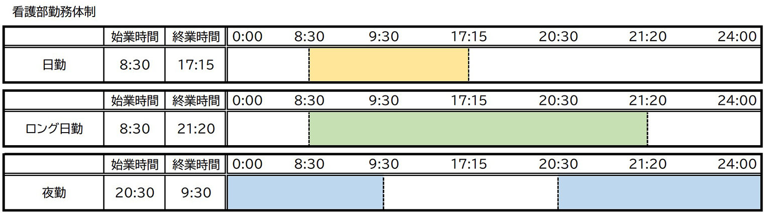 ※部署によっては、早出や遅出があります※休憩時間は、ロング日勤・夜勤は90分、他は60分です